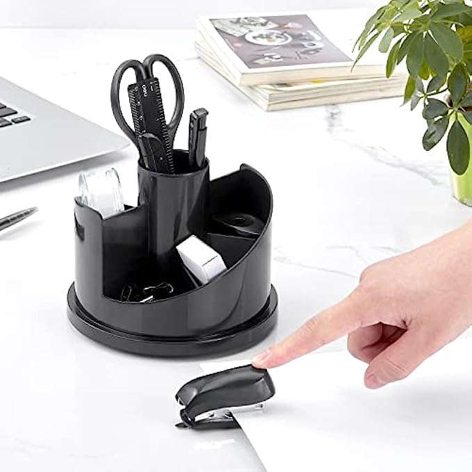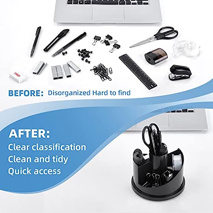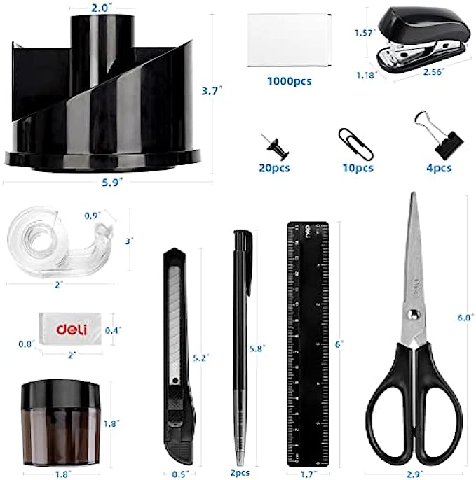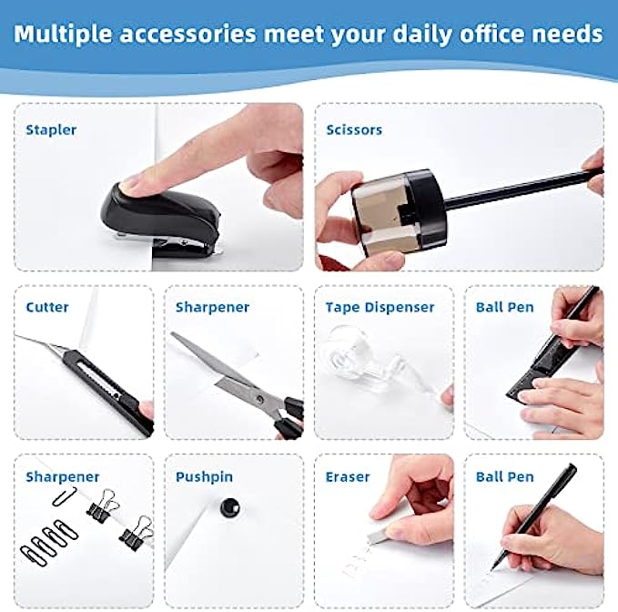 • 【WHAT YOU GET】The desk supplies set come with 1x rotating multi-functional pen holder, 1x Stapler, 1000x Staples, 1x Tape dispenser, 1x 15cm Ruler, 10x Push Pins, 2x Ball Pens, 1x Sharpener, 1x Scissors, 1x Eraser, 1x Tape, 4x Binder Clips, 1x Small Cutter, 20x Paper Clips