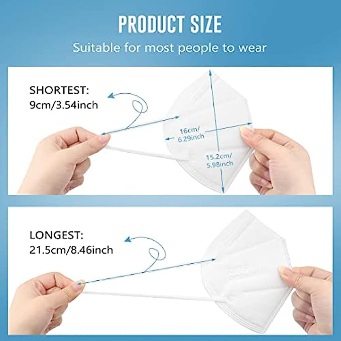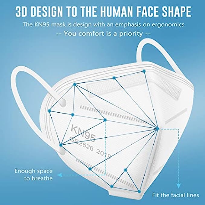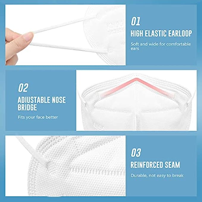 • Skin-friendly and Comfortable : These KN95 face mask use skin-friendly non-woven fabric, no irritation to your skin, High-elastic ear loops and adjustable nose clip to ensure a comfortable fit and no strain of ears
