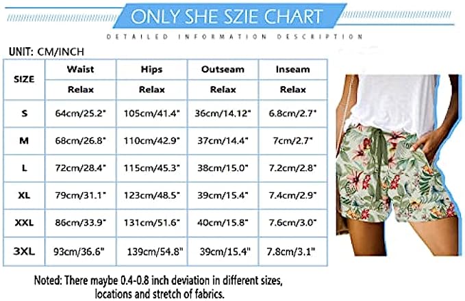 • Women's Shorts:Solid: 35%Cotton+60%Polyester,Printed Shorts: 95%Polyester+5%Spandex,Lightweight fabric with a cozy elastic drawstring waist, keeps you soft all day.