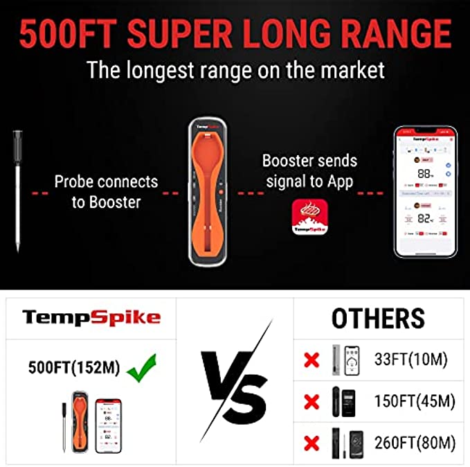 • 500-Ft Ultra-Long Range: Connected via the most advanced Bluetooth 5.2, this wireless thermometer for grilling can monitor your cooking from up to 500 feet away, truly wirelessly tracking your meal from anywhere!