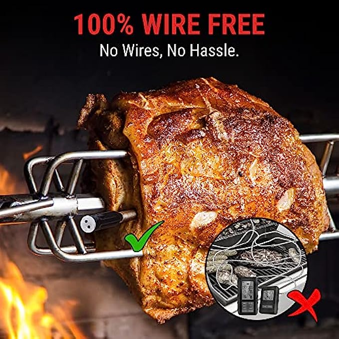 • 100% Wire-Free: Wireless thermometer for grilling removes all the tanged wires, makes it a versatile tool for electric rotisserie, BBQ, smoker, oven grilling, pan-fry or sous vide; Enjoy 100% wire-free cooking and the convenience of no-hassle setup and cleanup