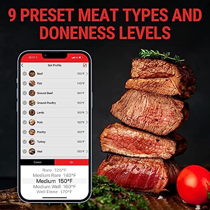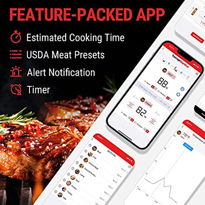 • Easy-to-Use, Multifunctional App: Get real-time alerts on the go with the smart thermometer App; Supports custom timer and temperature graphs; USDA-recommended preset temperatures elevate your cooking like a pro every time you fire up your grill with our smoker thermometer